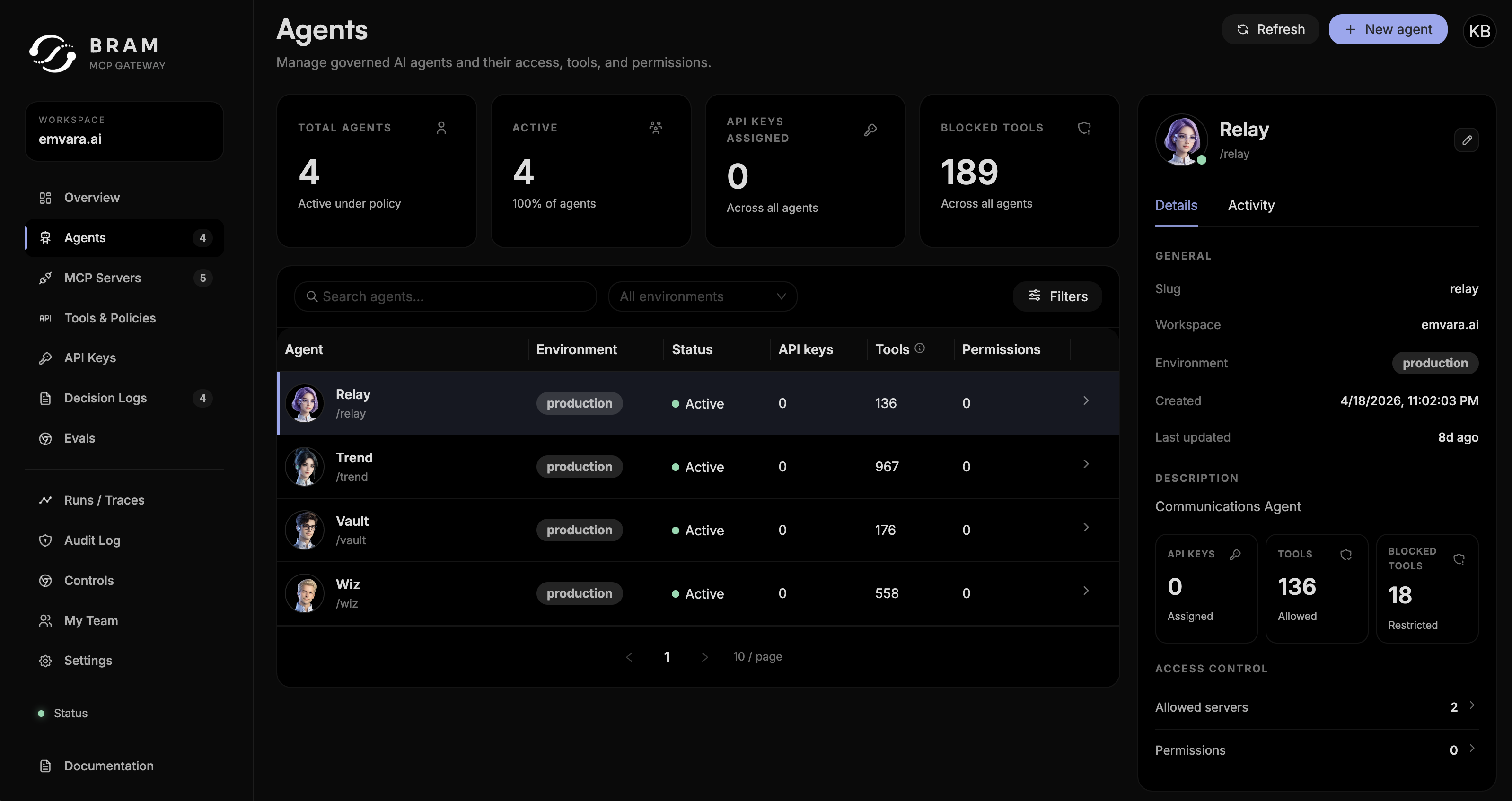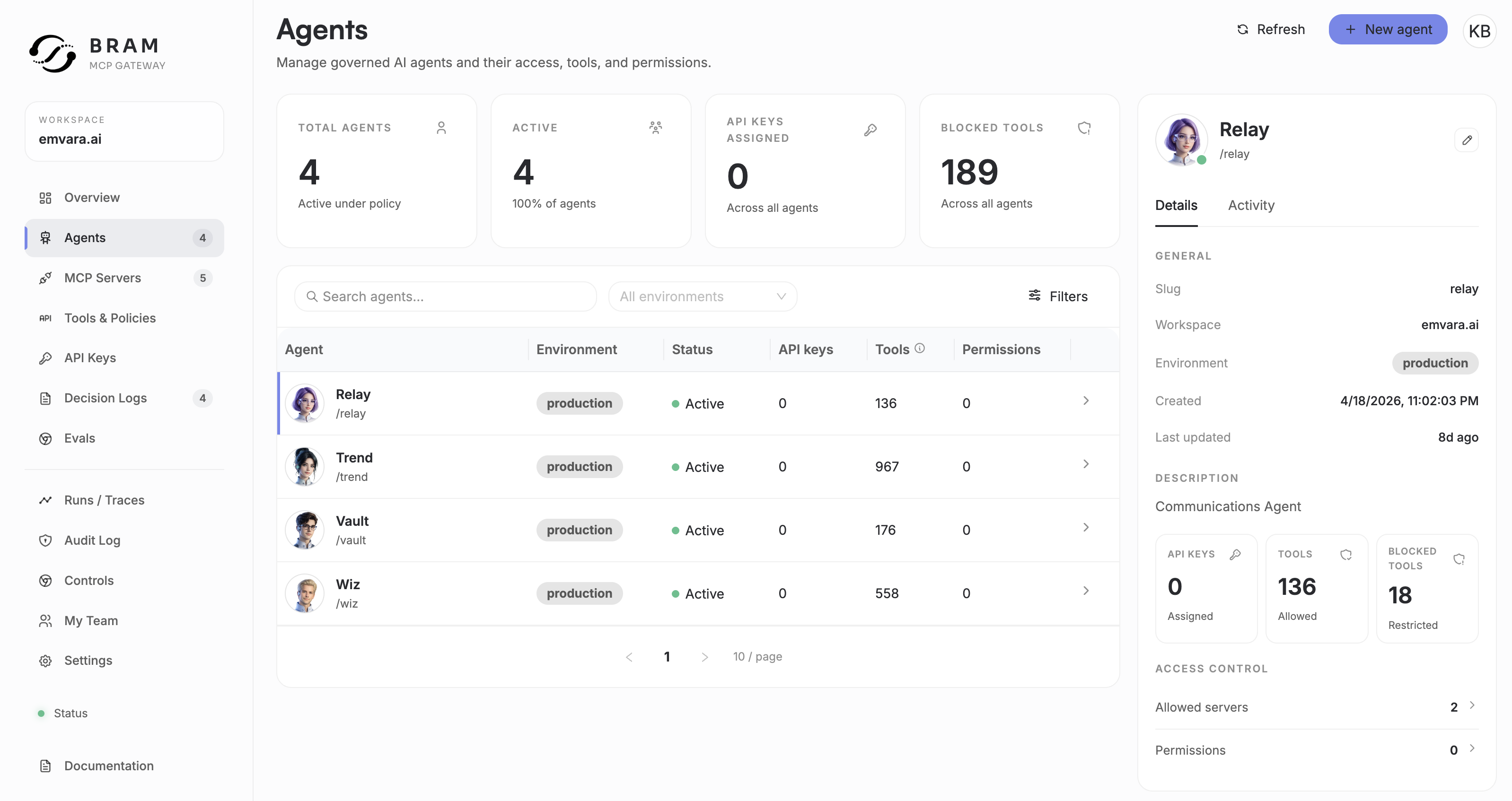 BRAM is an MCP gateway for production AI agents, built to observe every agent-tool call, enforce policies centrally, and run inline guardrails and post-hoc evaluations across connected MCP servers.