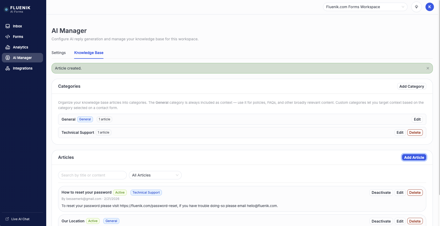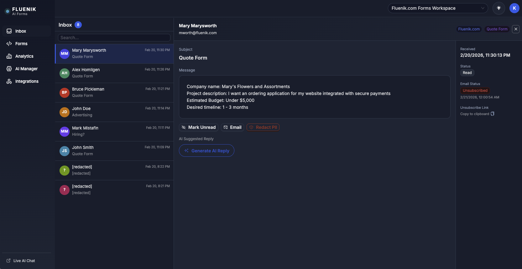 Fluenik AI Forms brings form collection, submission management, and AI-assisted response into a single platform. Teams can deploy branded, embeddable forms on any site and respond to submissions faster using AI tooling that is trained on their own content.