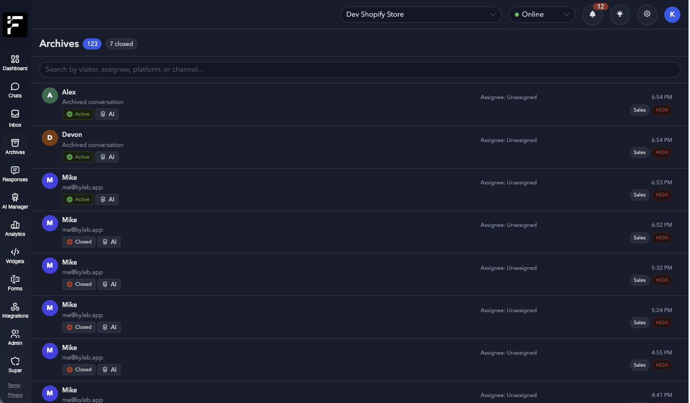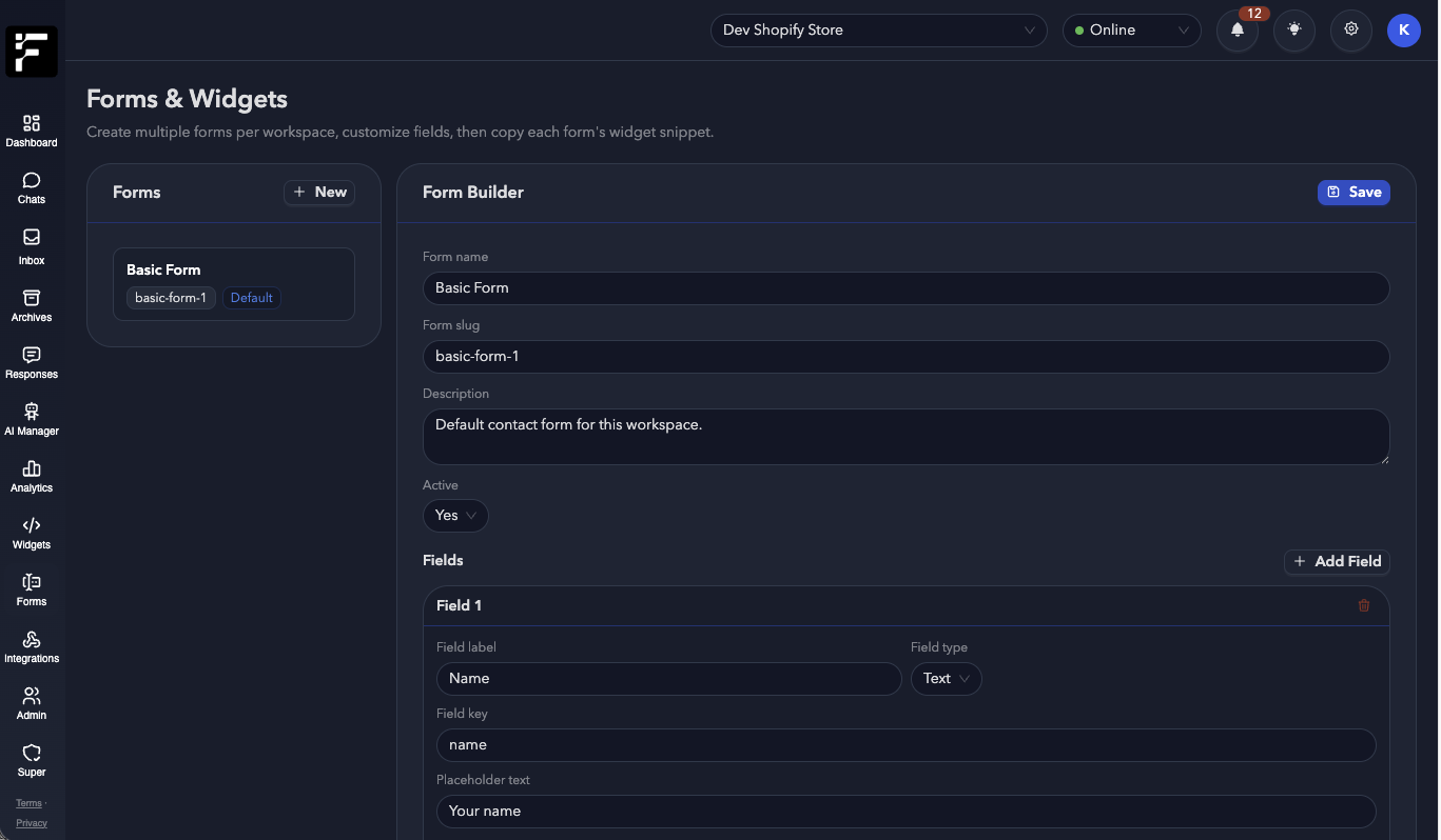 - a unified inbox spanning live chat, form submissions, and social (Instagram, Facebook)