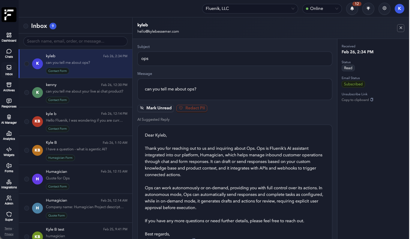Humagician brings chat, forms, social, and AI automation into a single platform with a clear operational model. Teams can move fluidly between human-led and fully automated support, deploy across any channel, and connect Ops to real workflows — replacing the suggestion-only pattern of most AI tools with actual task completion.